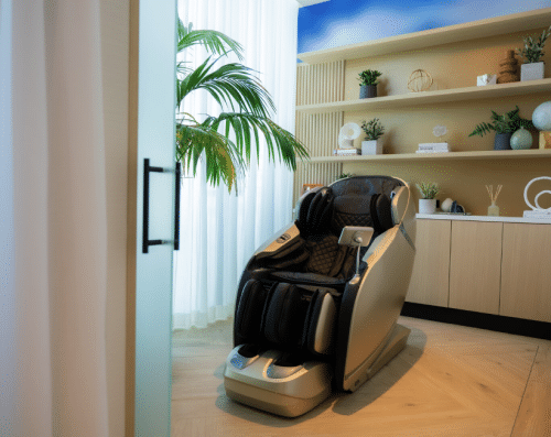 The 11,640 square foot lounge, located in the Terminal B to C Connector, between gates B40 and B39, provides distinct areas for recharging, including two wellness rooms that feature anti-gravity massage chairs and guided meditations from Master Well-Being Educator & Healer Devi Brown, a private nursing suite, two dual-head shower rooms, and all-gender restrooms stocked with Apotheke products.